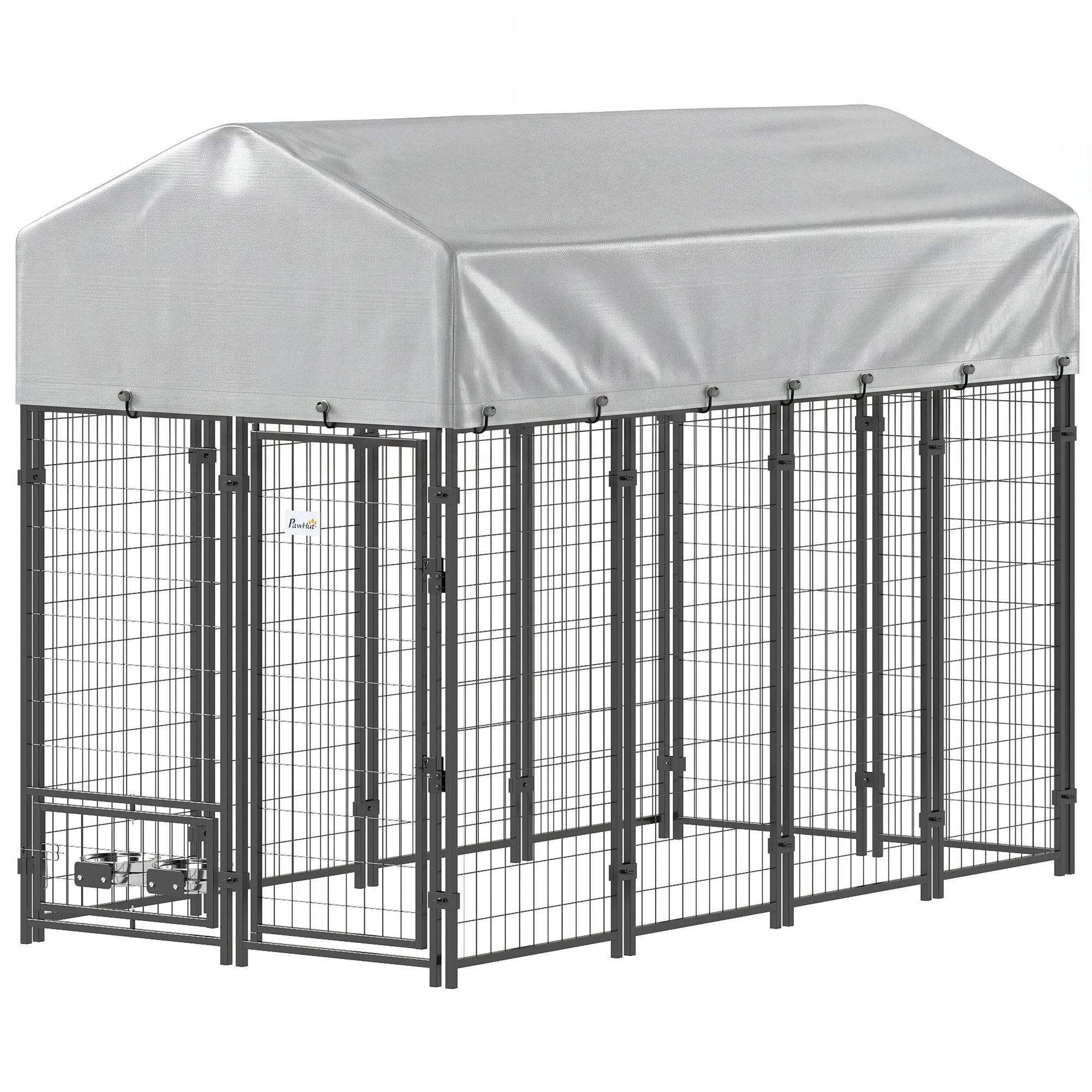 Get a spacious home for your furry friend with a PawHut large outdoor dog kennel. It has water-safe wire, a top cover with a solid metal roof frame, a lockable gate, and ample room for your dog. It's a practical kennel for your dog. This solid outdoor dog run can be used outside or inside, it's easy to assemble or disassemble and requires almost zero maintenance.
