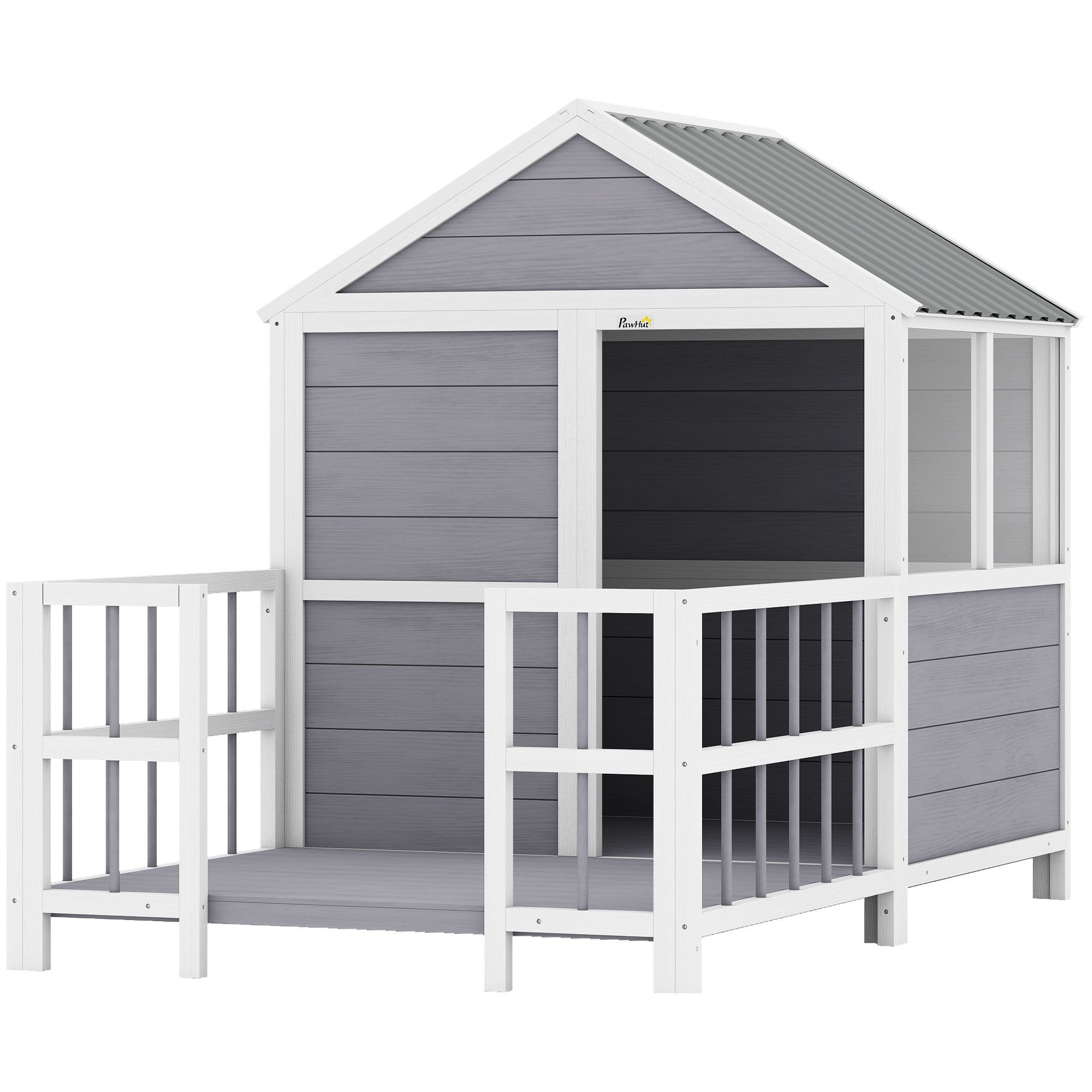 This PawHut outdoor dog house gives your large dog a cozy porch to enjoy fresh air and sunshine, while the sloped waterproof roof keeps them protected from rain and harsh sun. The spacious interior and raised floor provide a comfortable, well-ventilated space where your dog can stretch, relax, or play freely. Made from stable wood with clear observation windows, it's easy to keep an eye on your pet while ensuring they stay safe and comfortable all year round.