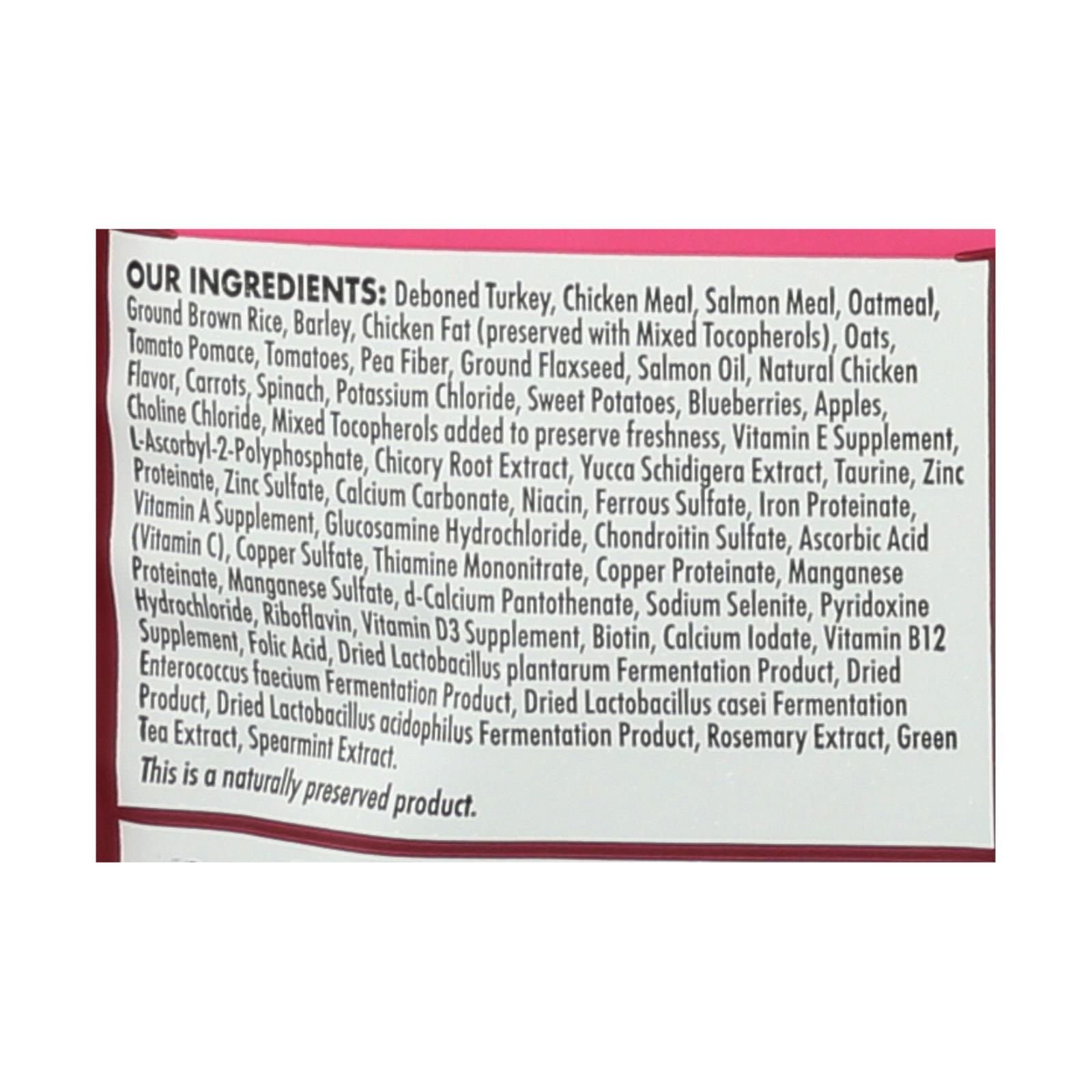 Blended with digestible grains like oatmeal and barley, plus omega-3 fatty acids from salmon oil and flaxseed, it promotes healthy skin, a shiny coat, and optimal digestion. Added probiotics and fiber support gut health, while calcium and glucosamine help maintain bone and joint strength.