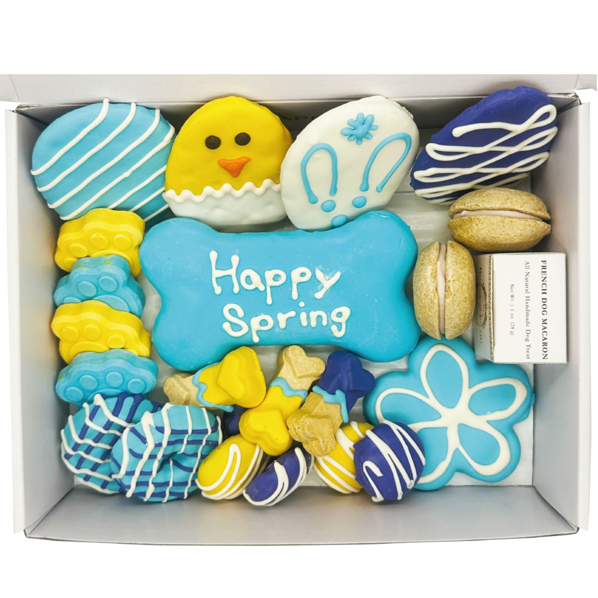 Spring has sprung! Time to celebrate with tasty treats for your beloved pup! Delicious, nutritious, and full of joy! Introducing the ultimate luxury box of spring-themed dog treats! Crafted with human-grade ingredients, these treats make the perfect gift for your pup or another dog lover in your life. Your pup will go wild for the 22 tantalizing treats including dog macarons, crunchy dog bones (perfect for a midday snack), truffies, and more! Each delightful morsel is sure to make your pup feel extra special this season.