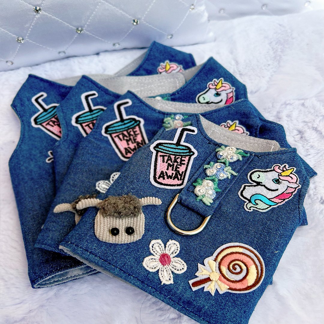 Introducing the stylish and functional Cool Pup Dog Harness by Hello Doggie! Crafted from denim fabric and luxuriously lined with micro suede, this harness is designed to provide both comfort and durability for your furry companion. The inclusion of a secure d-ring allows for tether attachment, ensuring your baby's safety during walks or outings. Thanks to the convenient Velcro straps, this harness is not only secure but also easy to put on and take off. The decorative patchwork and three flowers, available in blue or pink, add a touch of charm to the design, each adorned by genuine Swarovski crystals for a hint of sparkle. Treat your pup to the ultimate combination of fashion and practicality with the Cool Pup Dog Harness - a must-have accessory for every stylish pet parent and their cool pup! Wash in cool on gentle cycle, no bleach or softener and air dry or tumble on low. LIMITED EDITION Sizes | XS - LG  *Harnesses are handmade, sizes may vary slightly. Made in USA.