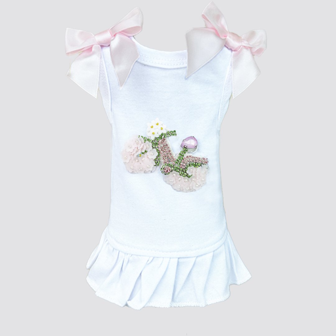 Presenting the charming Summer Stroll Dog Dress by Hello Doggie, an enchanting dress that exudes elegance and style. This delightful dress features a captivating handmade bicycle appliqué adorned with shimmering rhinestones and a striking pink Swarovski Crystal, adding a touch of sophistication and glamour to your furry friend's wardrobe. The dress is also embellished with dainty satin bows, enhancing its feminine allure and creating an irresistible look that's perfect for summer strolls and special occasions. Crafted with meticulous attention to detail and available in various sizes to accommodate different breeds, the Summer Stroll Dog Dress offers a comfortable and fashionable fit for dogs of all shapes and sizes. Elevate your pet's style and ensure they turn heads at every outing with this exquisite dress that embodies the epitome of canine couture. This dress is easy to care for turn inside out, wash cool on delicate, no bleach or softener and air dry. Sizes XXS - LG MSRP $38.00 *Dresses are handmade and sizes may vary slightly. Made in USA.